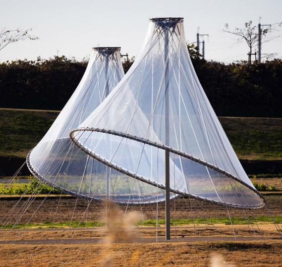 筑后廣域公園位于矢部川旁,是福岡縣面積最大的公園。隈研吾事務(wù)所在這座公園內(nèi)設(shè)計(jì)了一組輕盈透明的膜結(jié)構(gòu)裝置。