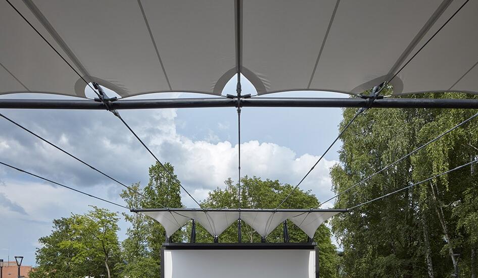 無論是晴朗的午后還是雨夜,舞臺和觀眾席上方的織物膜材屋頂不僅能提高演員和觀眾的舒適度,還能提升影院劇場的聲學(xué)特性。采用張拉膜結(jié)構(gòu)屋頂解決方案的目的是最大限度地減輕建筑的重量,考慮到建筑的高自由度,增加了額外的支撐元素。繩索的鋼結(jié)構(gòu)支撐不僅是功能和技術(shù)元素,也是美學(xué)元素。