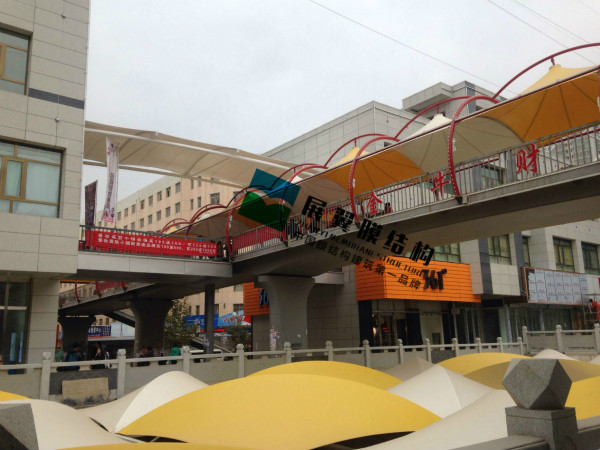 蘭州金牛街膜結(jié)構(gòu)工程全系列包括膜結(jié)構(gòu)天井、膜結(jié)構(gòu)屋頂遮陽(yáng)棚、膜結(jié)構(gòu)天橋通道遮陽(yáng)棚、啤酒屋膜結(jié)構(gòu)屋頂、特殊膜材玻璃房等等、工程全部采用彩色膜材搭配建造,造型設(shè)計(jì)別出心裁。這些張拉膜建筑不但具備強(qiáng)大的實(shí)用功能,同時(shí)也成為了商業(yè)街一大觀賞亮點(diǎn)。