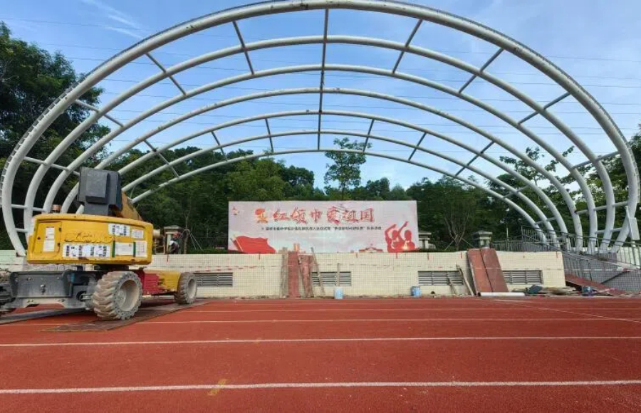 深圳美中學(xué)校張拉膜結(jié)構(gòu)工程正在施工,工程體量包含主席臺(tái)遮陽(yáng)棚的建設(shè),目前鋼結(jié)構(gòu)安裝工作已完成。